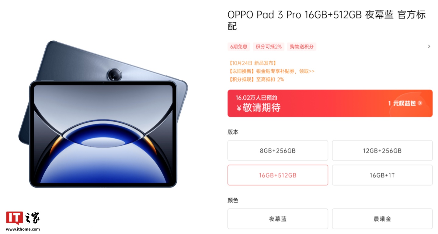 IT之家 10 月 14 日消息,OPPO Pad 3 Pro 今日在电商平台上架,页面显示 10 月 24 日发布。