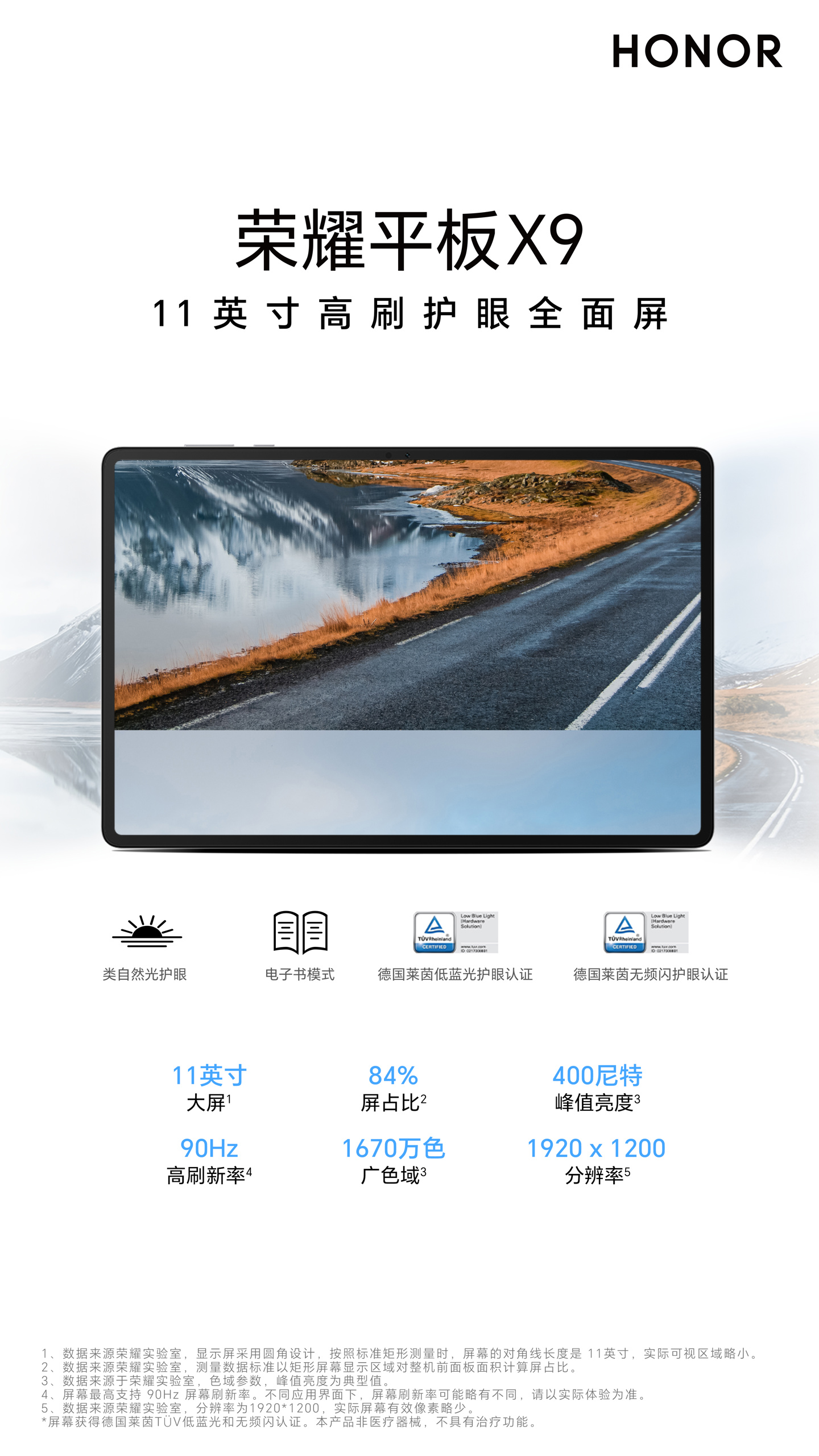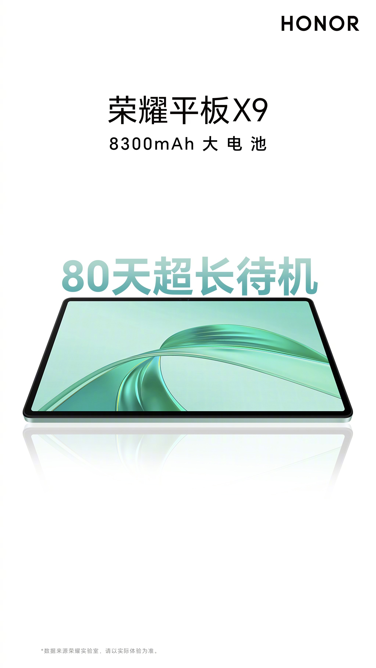 另外,荣耀平板 X9 还将配备 8300mAh 电池,官方宣称“80 天超长待机”。