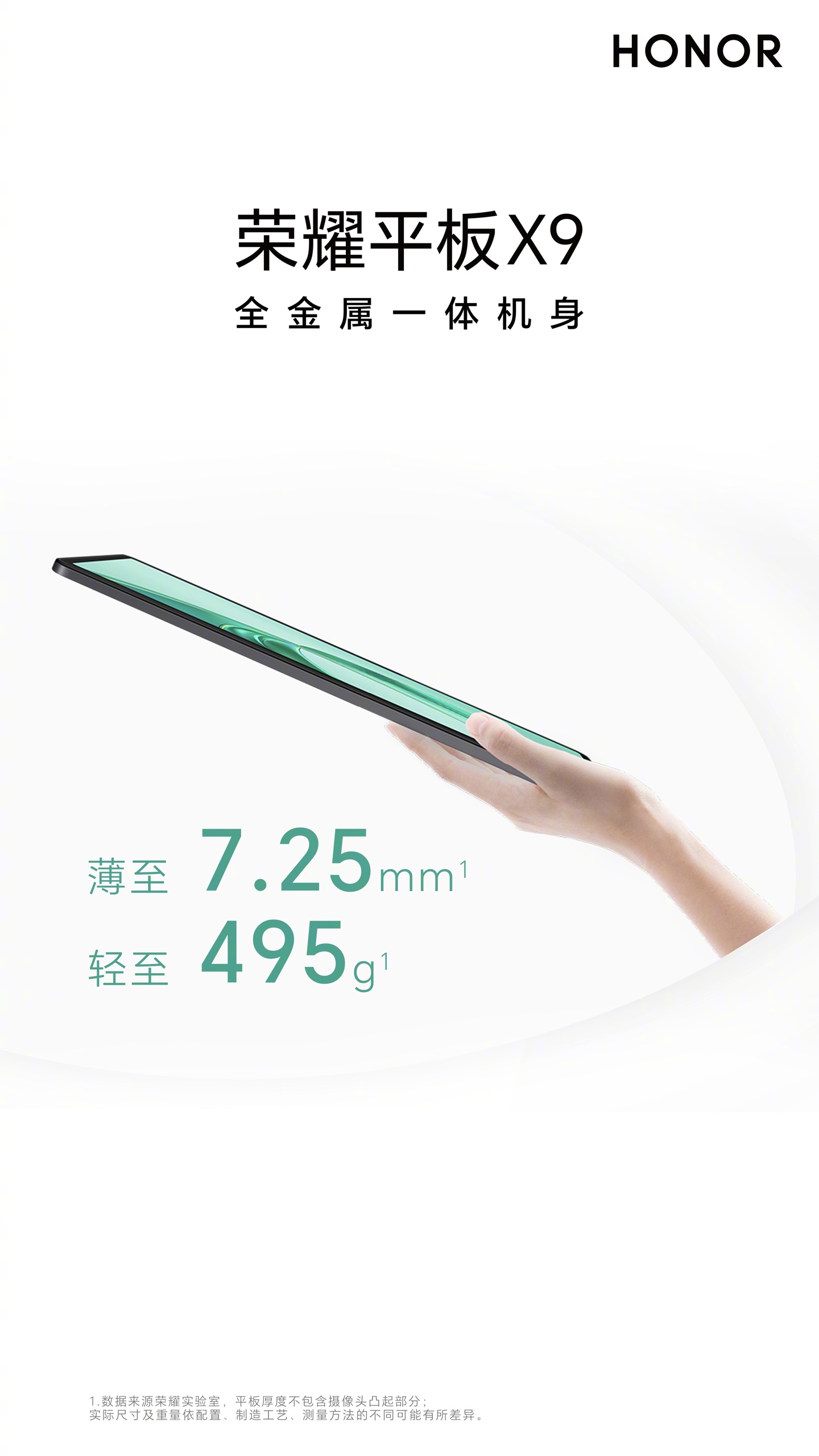 IT之家 10 月 14 日消息,荣耀平板 X9 将于 10 月 16 日 19:30 发布,官方今日再次对新品进行预热,称该平板采用全金属一体机身,旗舰级同款用料,薄至 7.25mm,轻至 495g。