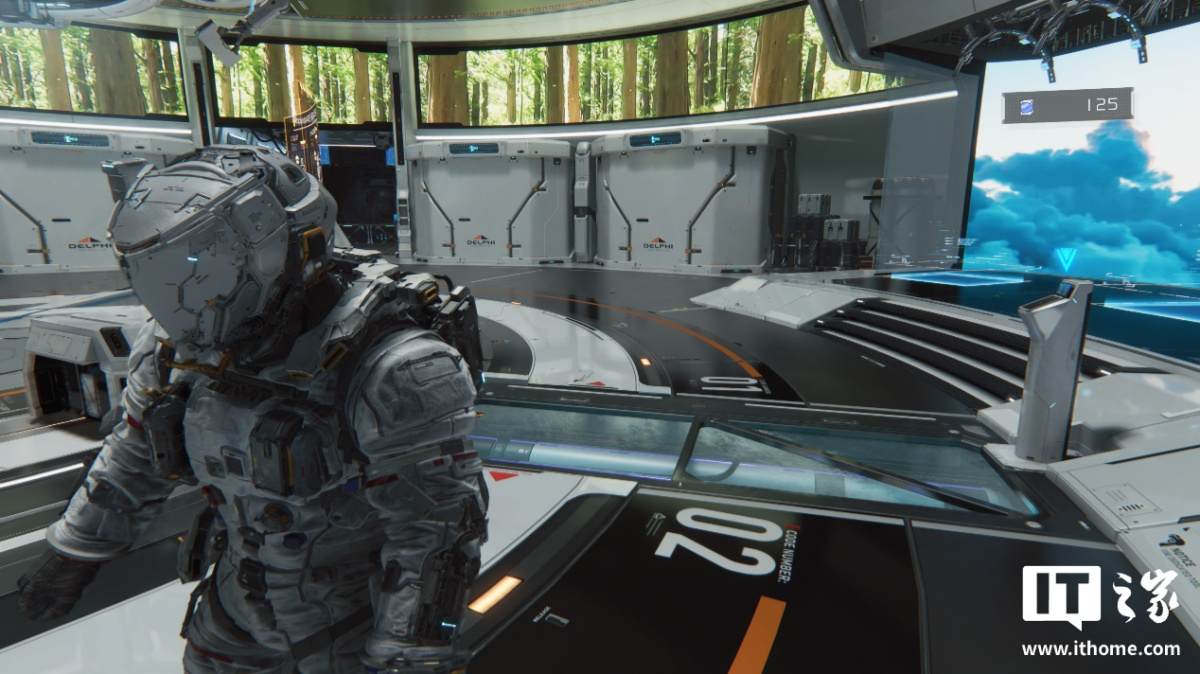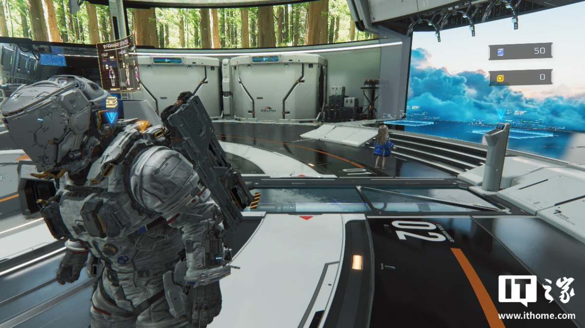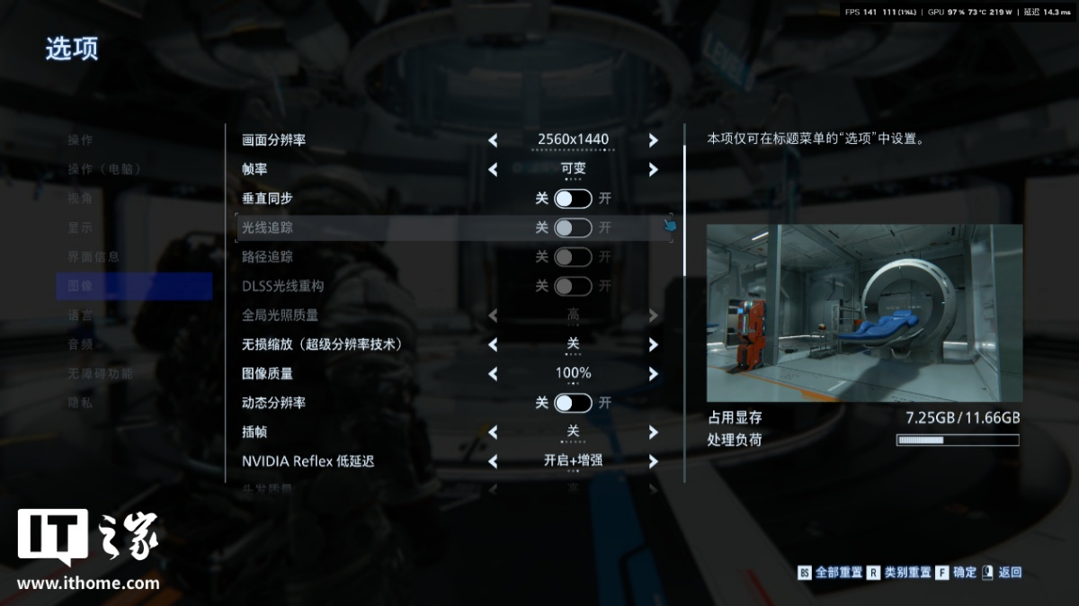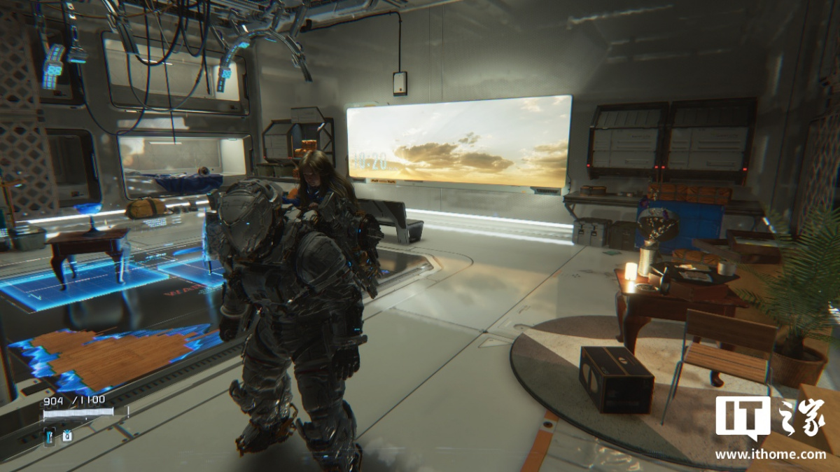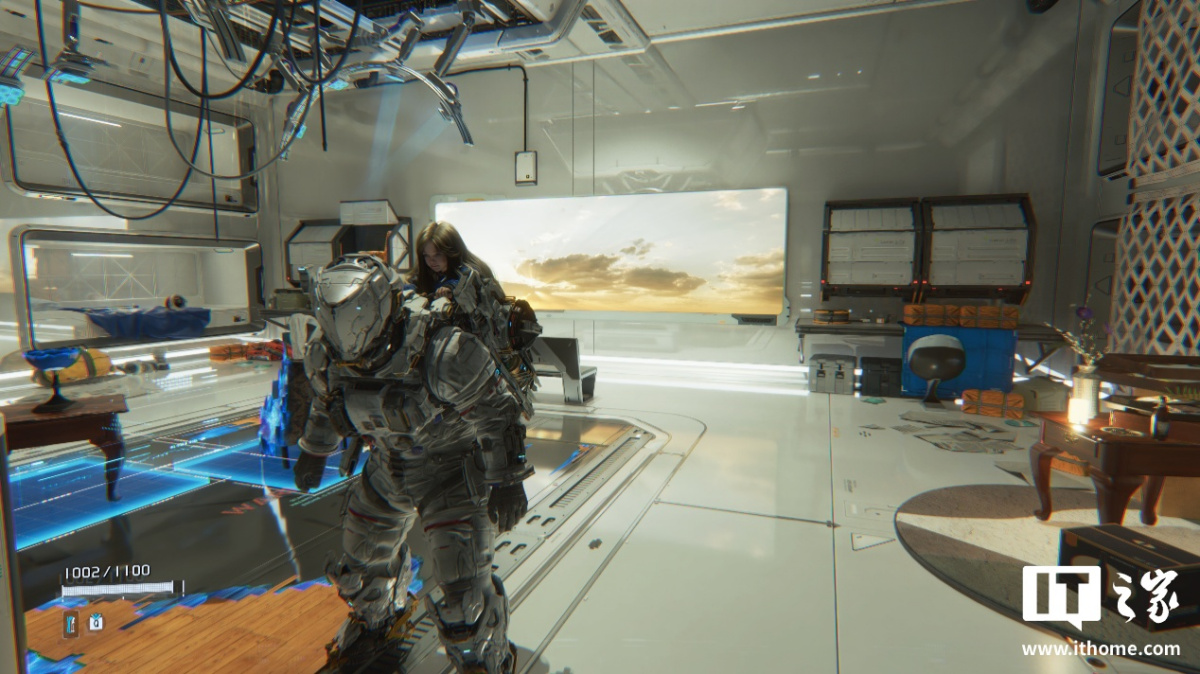 第一个测试场景,我们选择了玩家可以升级装备和自身能力等级的空间站大厅,这里整体被光线点亮,很适合测试路径追踪的表现。