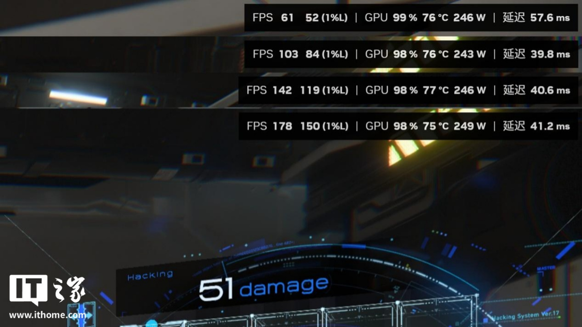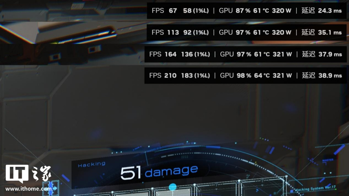 不仅如此,游戏的 1% Low 帧也稳步提升,分别来到了 109 帧、138 帧和 169 帧,因此每提升一档多帧生成倍数,游戏的流畅性也会显著上升,不存在只有平均帧好看的假流畅。而游戏平均延迟上,虽然本作为动作射击,但玩家面对的并不是对操作精度极其敏感的在线 PVP,而且一笔画黑客玩法的加入,让官方放宽了怪物攻击速度释放后僵直时间,BOSS 技能则更依靠玩家背板和躲避操作,因此最高不到 40ms 的游戏延迟完全可以接受。