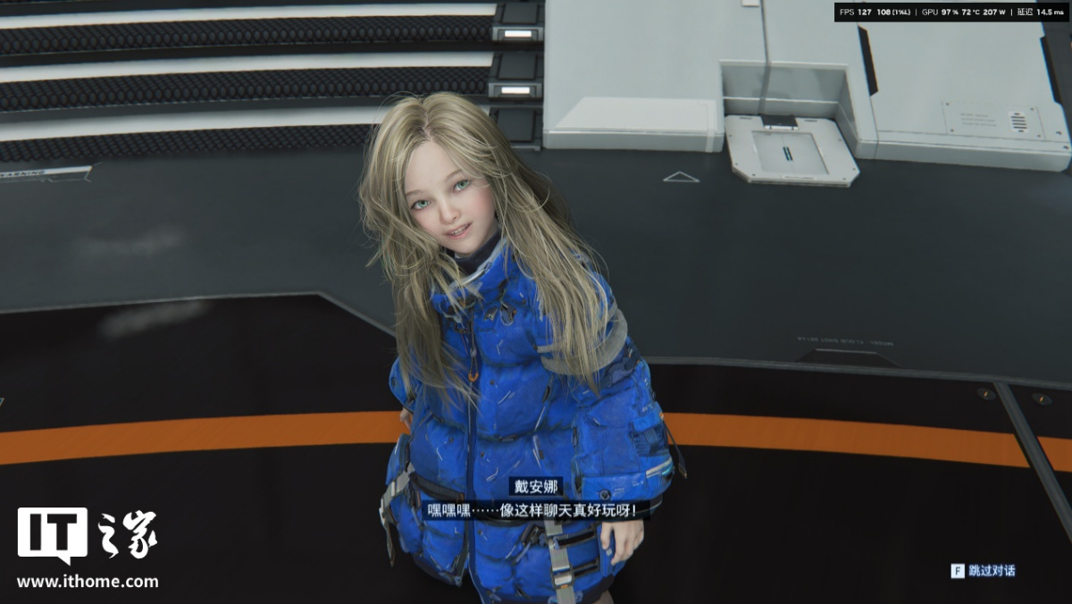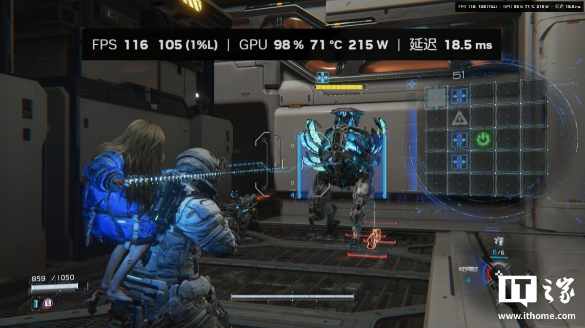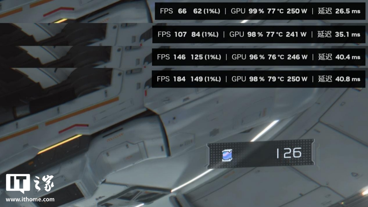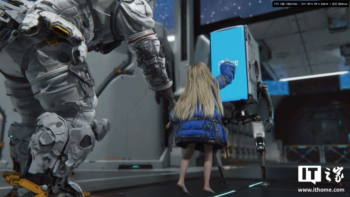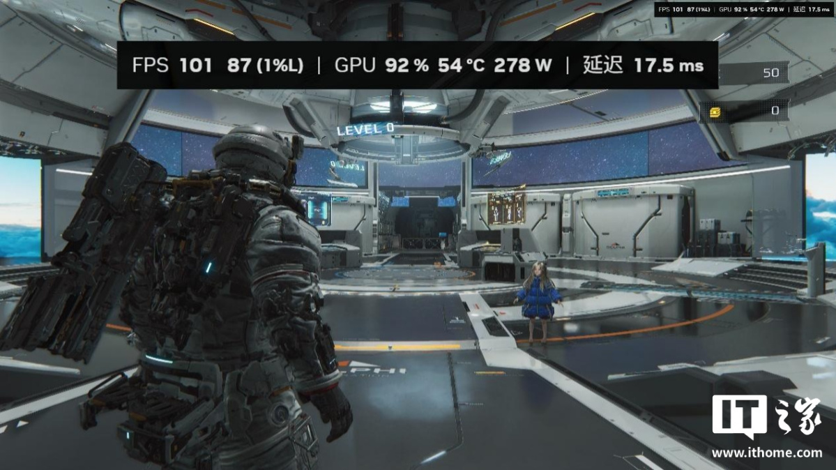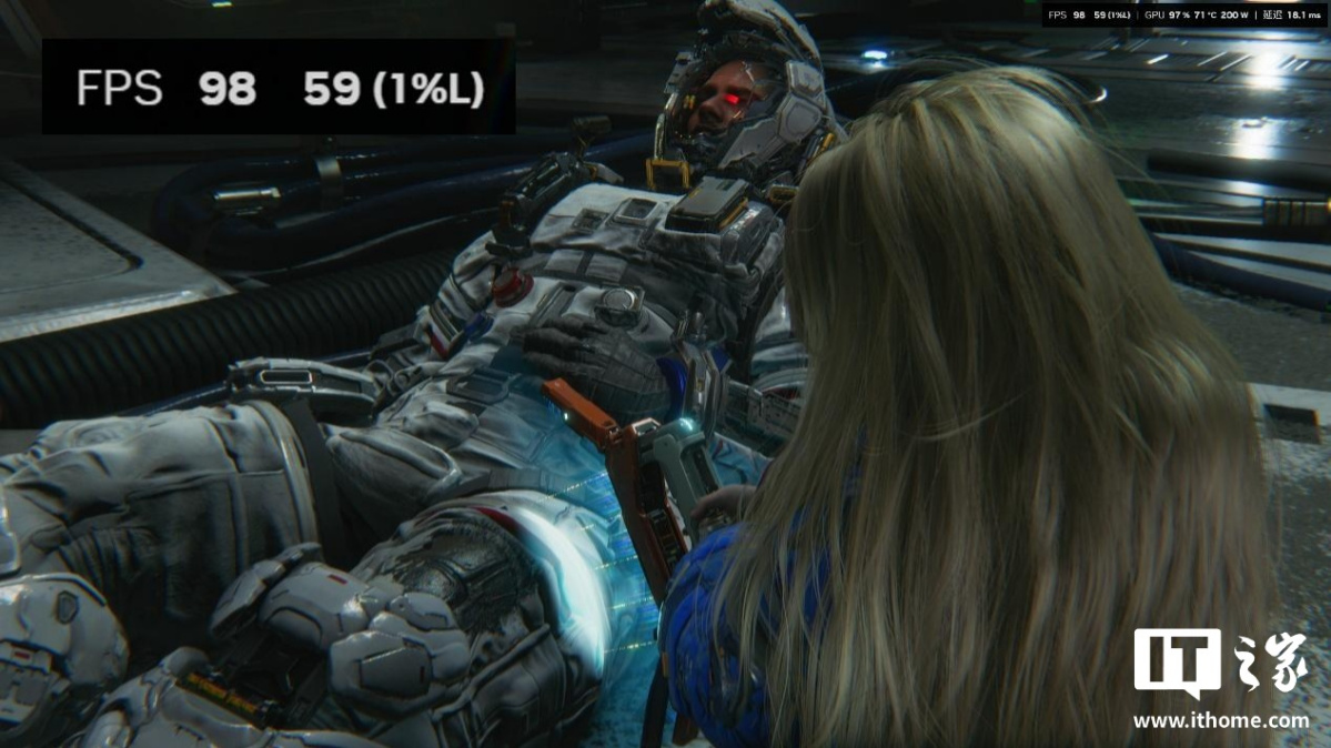 在游戏中,我们完整体验第一个地图后,发现绝大多数空间站的室内跑图场景,RTX 5080 显卡在开启路径追踪 + DLSS 性能 + DLSS 4 倍多帧生成下,游戏平均帧数都保持在 200 帧以上,1% Low 也不会低于 150 帧。只有剧情过场动画中,由于帧生成无法生效,游戏的平均帧数才会掉到 100 帧以下,因此开启多帧生成后,进入播片的前一两秒会有个明显的掉帧感。