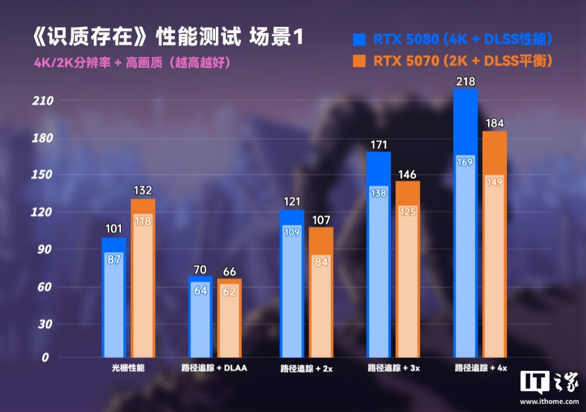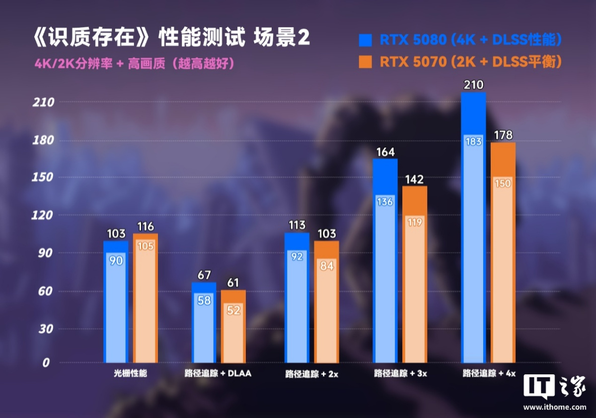 先看 RTX 5080 显卡的表现,游戏设置会采用 4K 分辨率 + 高画质预设(默认)下进行,开启光线追踪后则采用 DLSS 性能档位和 DLSS 4 多帧生成选项依次对比。