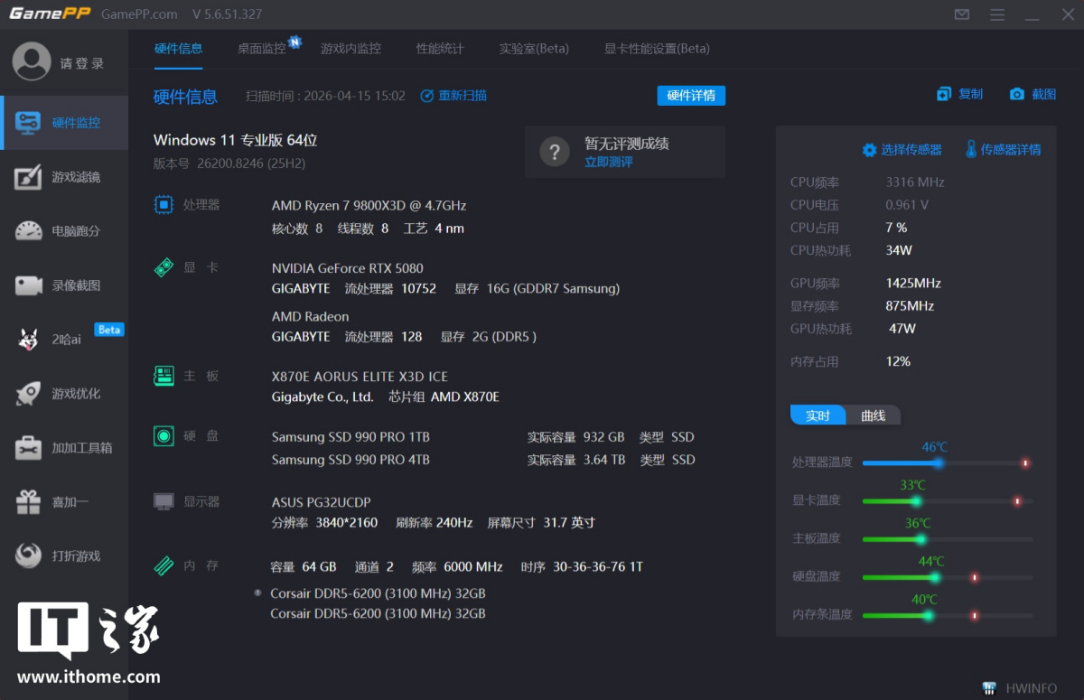 为了给玩家朋友们提供具有价值的性能参考,IT之家这次以 AMD 锐龙 7 9800X3D 处理器,技嘉 X3D 冰雕主板,搭配 RTX 5080 和 RTX 5070 显卡,64GB DDR5 6000MHz C30 内存套条为核心搭建测试平台。