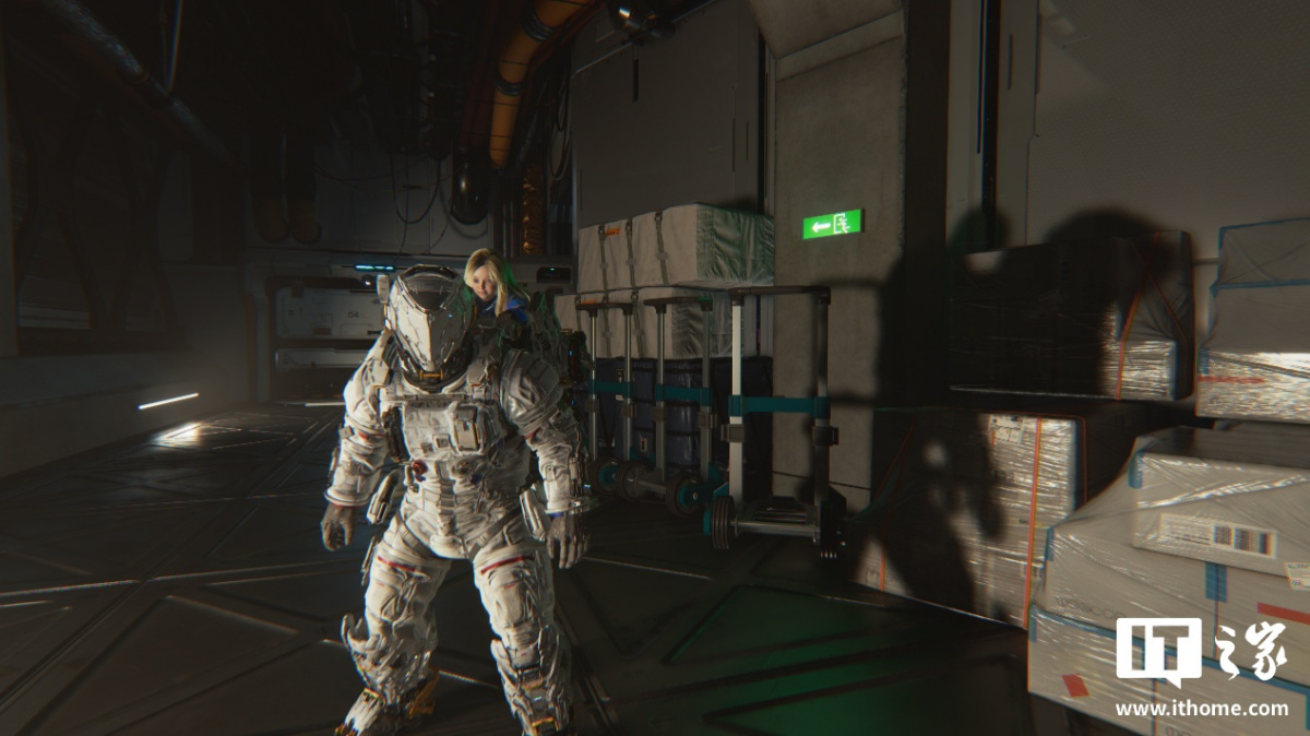 第三个场景我们选择了空间站中的货物通道,主角左侧是一块强光源的显示屏,不仅将主角宇航服左半边和右侧靠墙摆放的货物整体照亮,还将人物的影子投射在了墙上。