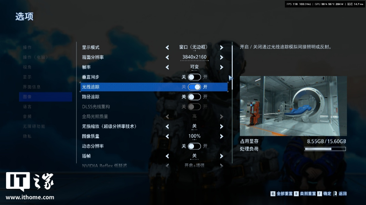 在显存占用上,关闭和开启光线追踪时,系统预估的显存占用分别为 7.7GB 和 8.5GB 左右,对 RTX 5080 来说问题不大。