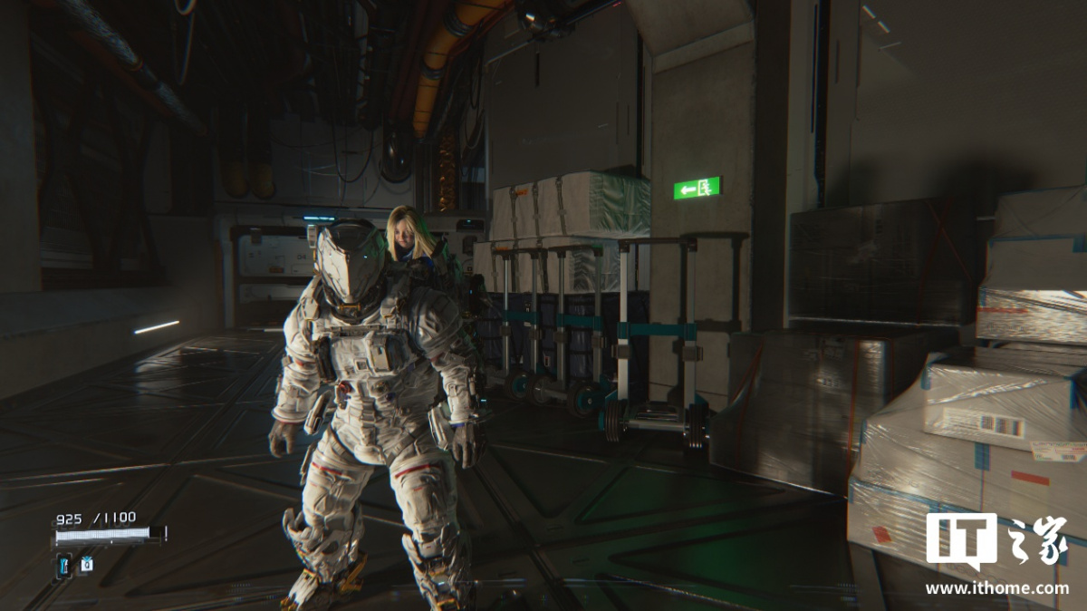 第一个场景,我们选在了第一章的空间站大厅,这里的光线比较复杂,场景足够明亮。在未开启光线追踪时,主角身后屏幕下方的部分墙壁被染上了绿色,而开启光线追踪后不存在这个问题。