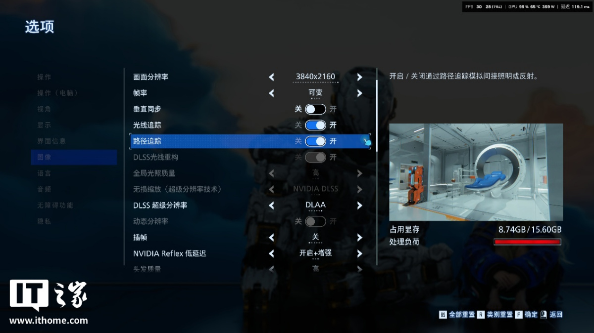 但是玩家在开启路径追踪后,性能压力瞬间暴增,显存占用虽然标注为 8.7GB,但处理负荷条已经变红,NVIDIA App 性能监测显示实际游戏帧数只有 30 帧,显然即使是 RTX 5080 显卡,在 4K 分辨率 + 高画质下,开启路径追踪的代价也是非常大的。