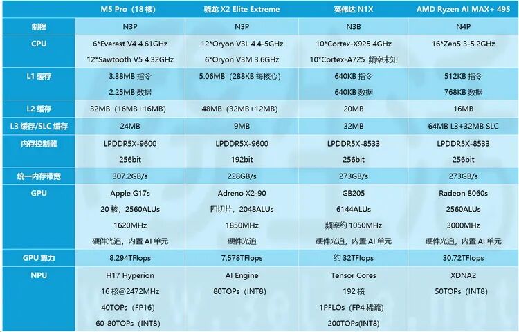 为了让大家能够更清晰的看出M5 Pro与其“潜在竞品”之间的参数差异,我们三易生活结合公开信息编制出了下面这张表格。