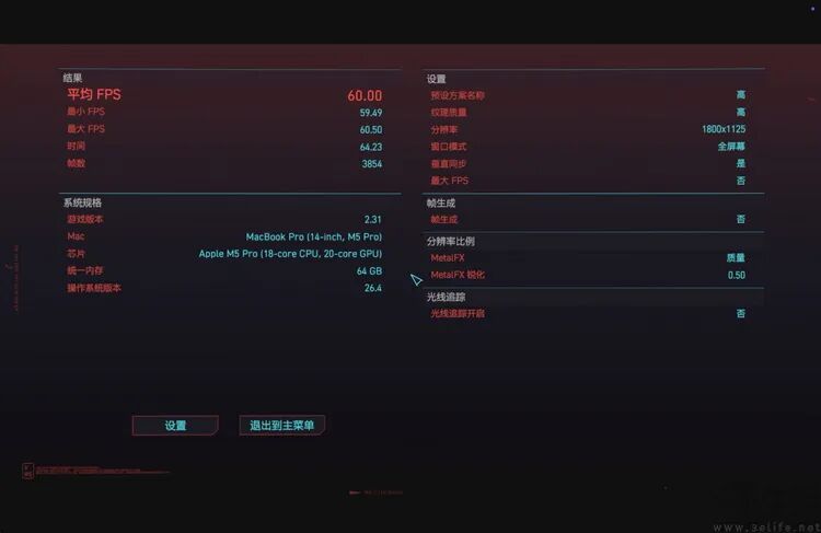 由于《赛博朋克2077》已经原生支持MacBook,所以我们先用它进行了两种画质设定下的游戏性能测试。从结果来看,它对于M5 Pro的优化相当出色,甚至可以在高画质和近似1080P分辨率的设定下稳定跑到60FPS。