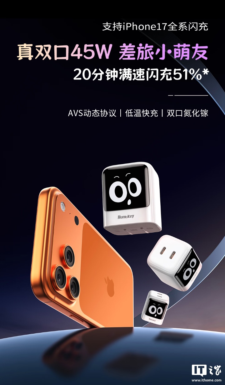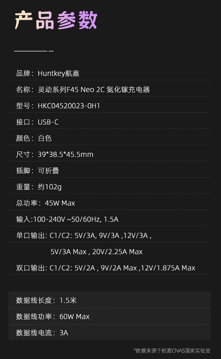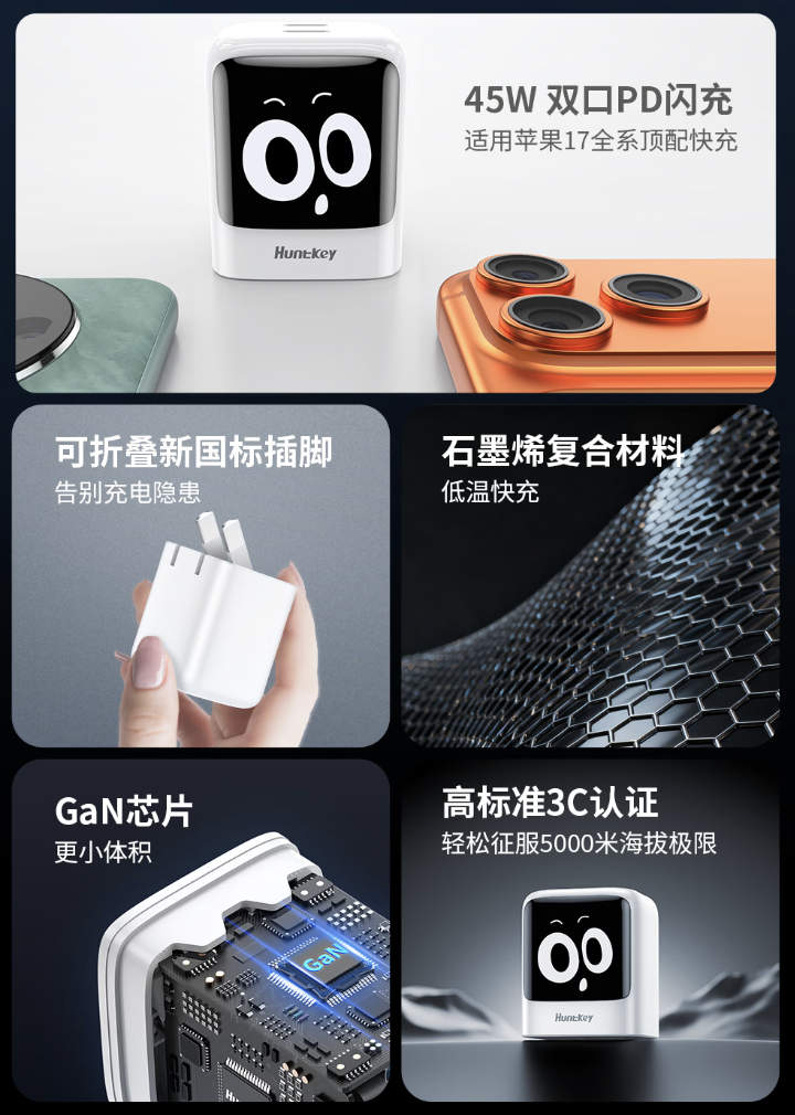 该产品采用黑白配色,正面黑色面板印有呆萌表情包,下方丝印航嘉 LOGO。底部配备可折叠插脚,顶部配备双 USB-C 接口(每个接口均为 45W 输出,双口同时输出至高 45W),支持 AVS 3.2/UFCS/ SCP / PPS / QC 协议。