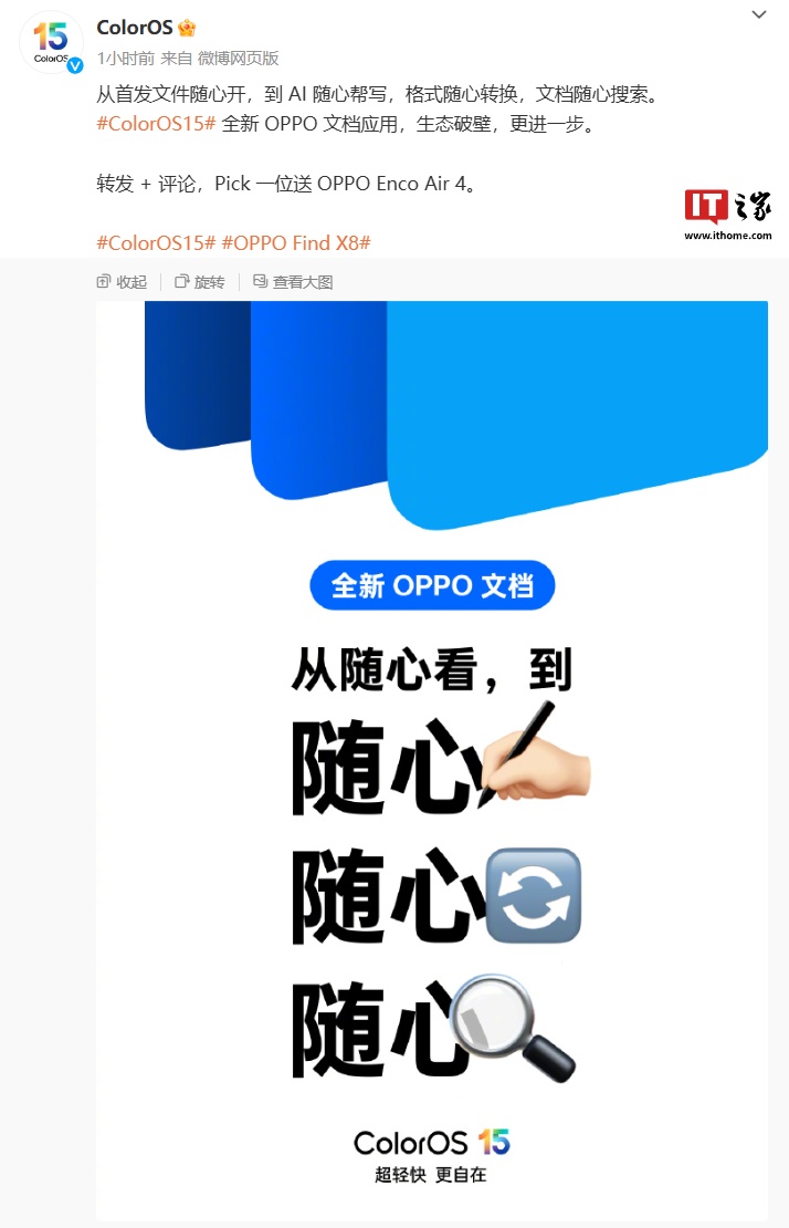 OPPO ColorOS 设计总监陈希随后发文透露,ColorOS 15 将推出了全新的 OPPO 文档,将 AI 能力融入到文档的话编辑写作、格式转换以及搜索中,带来全新的一站式 AI 文档体验。