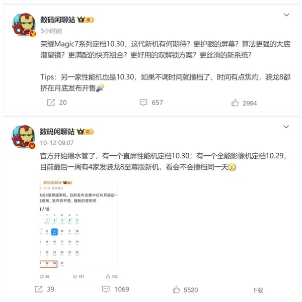 博主数码闲聊站暗示,iQOO 13会在10月30日登场,与荣耀Magic7系列发布时间是同一天。