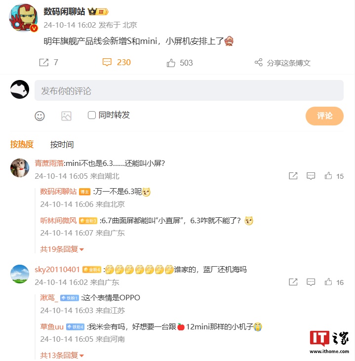 IT之家 10 月 14 日消息,博主 @数码闲聊站 今日发文爆料,“某厂”明年旗舰产品线会增加 S 和 mini,“小屏机安排上了”。结合评论区讨论来看,该厂商预计为 OPPO。