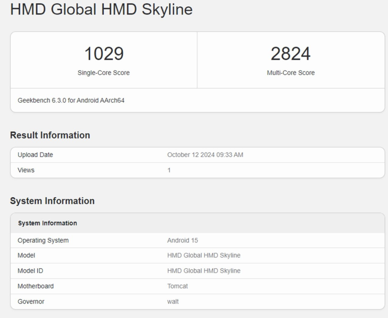 相关页面信息显示,HMD Skyline 手机在升级安卓 15 之后单核测试成绩为 1029 分,多核测试成绩为 2824 分。