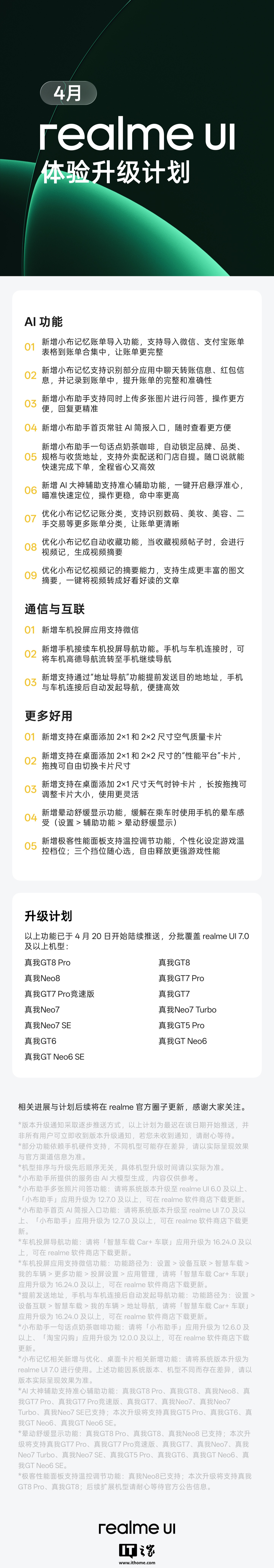 IT之家附 realme UI 系统 4 月体验升级计划如下: