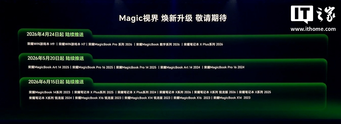 IT之家 4 月 23 日消息,在今日的荣耀 WIN 游戏本暨全场景新品发布会上,荣耀官方公布了老款笔记本和平板的更新计划。