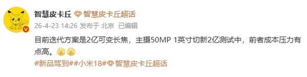 【CNMO科技消息】近日,数码博主“智慧皮卡丘”在社交平台发文称,小米18系列影像硬件正在迭代测试中,目前方案包括“2亿像素可变长焦”,同时主摄维持“50MP 1英寸”,并提到“切新2亿测试中”,暗示主摄存在从5000万像素一英寸方案转向2亿像素方案的可能。该博主同时表示,2亿像素可变长焦方案在落地层面“成本压力有点高”。