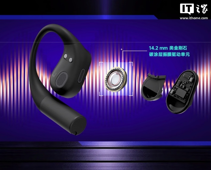 这款耳机使用黑色外观,采用人体工学耳挂开放式设计,号称能够消除入耳式设计常带来的压迫感;其采用 14.2mm 类金刚石碳涂层振膜驱动单元,支持 2.4GHz 和蓝牙 6 双模连接,支持四麦克风阵列与 AI 降噪技术,支持个性化音效模式,耳机本体续航 16 小时,搭配充电盒可达 64 小时,支持 USB-C 直通充电。