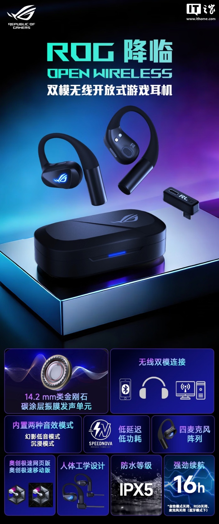 IT之家 4 月 24 日消息,华硕旗下 ROG 降临 Open Wireless 无线开放式游戏耳机将于今晚 8 点发售,标准价 1399 元,首发价 1199 元。
