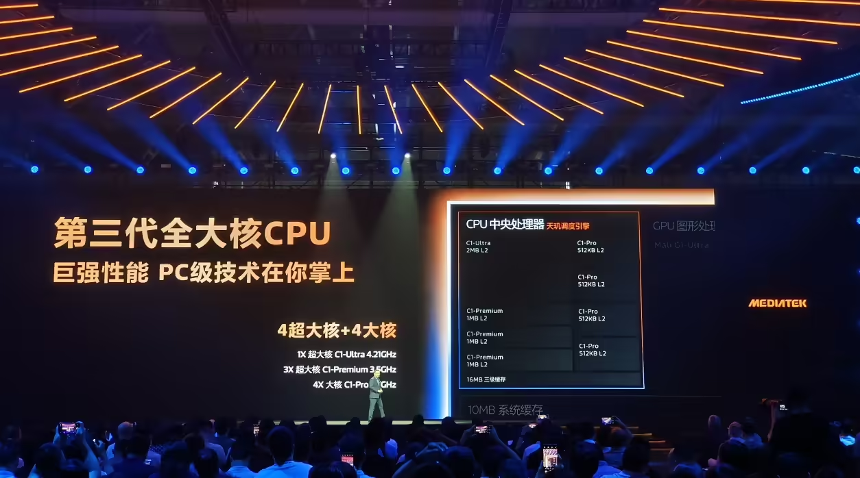 CPU 部分由 1 颗主频高达 4.21GHz 的 C1-Ultra 超大核(2MB L2)、3 颗 3.5GHz 的 C1-Premium 超大核(1MB L2)以及 4 颗 2.7GHz 的 C1-Pro 大核(512KB L2)组成;不仅如此,L3 缓存进一步扩容至 16MB,SLC 系统缓存也达到了 10MB。