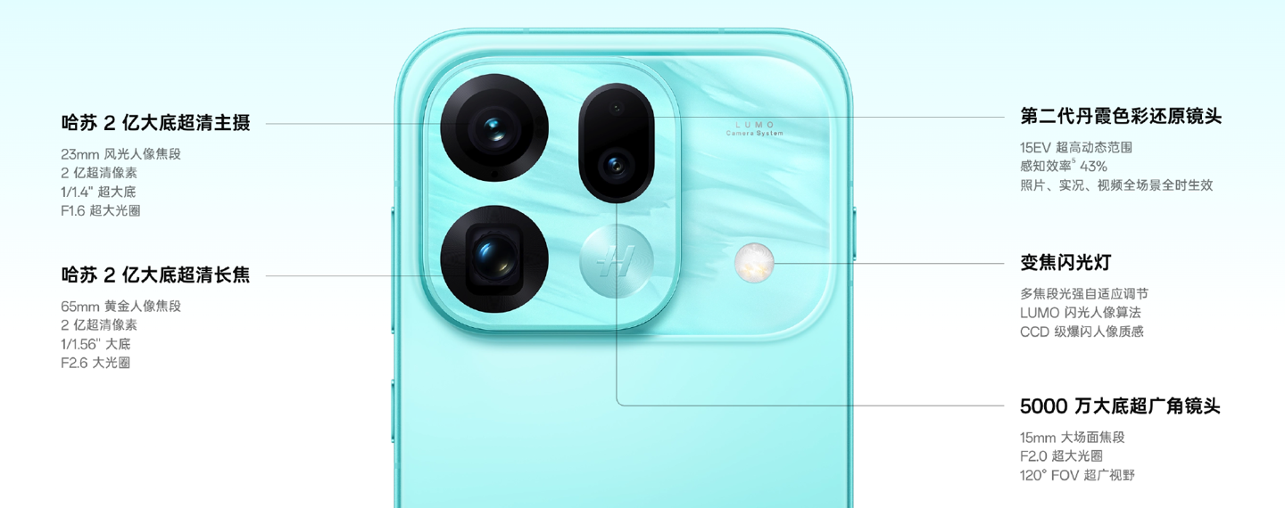 此外,后置模组还专门集成了一颗 320 万像素的“丹霞色彩还原镜头”,拥有 15 档动态范围及 DCG HDR 能力,结合多光谱协同算法进一步优化色彩表现。
