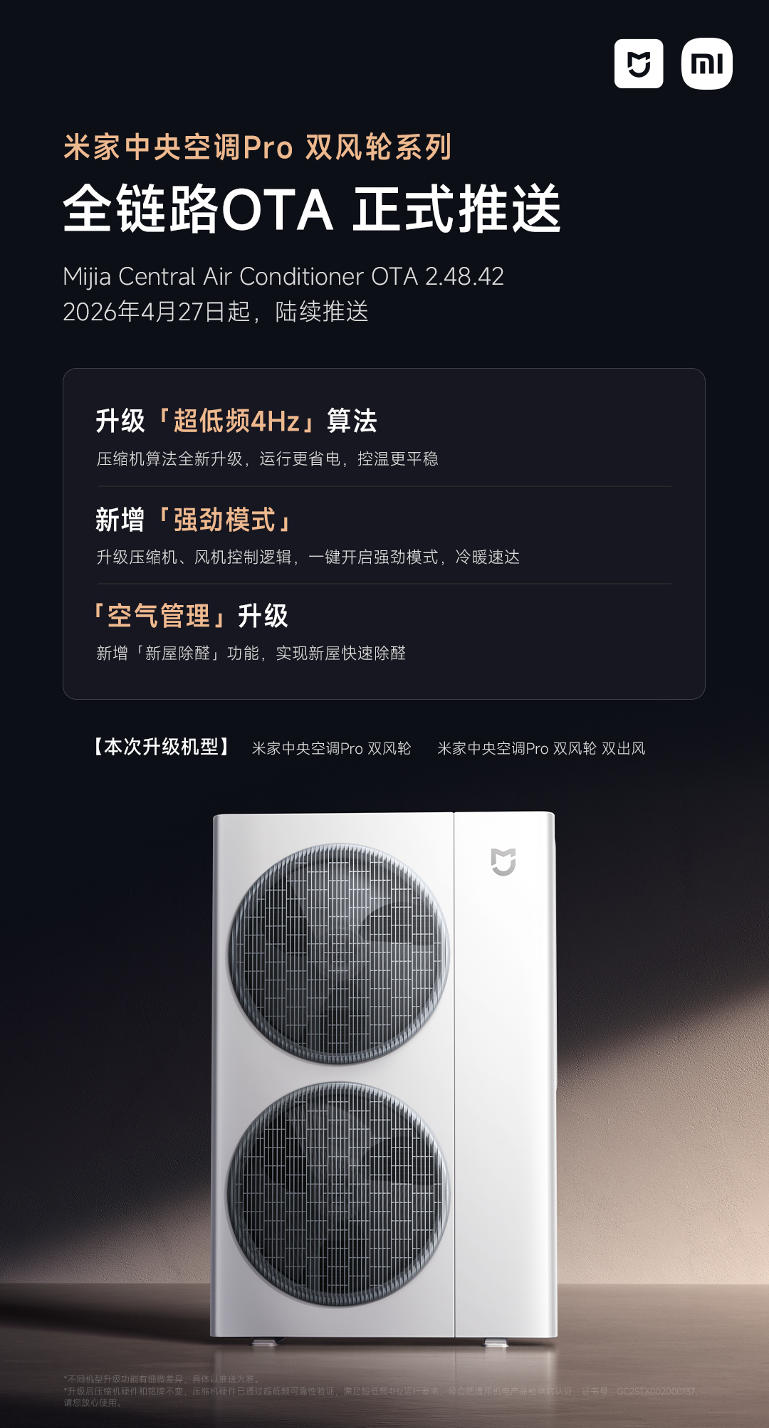 IT之家 4 月 27 日消息,小米智能生态今日宣布,米家中央空调 Pro 双风轮系列全链路 OTA 正式推送,版本号为 Mijia Central Air Conditioner OTA 2.48.42。