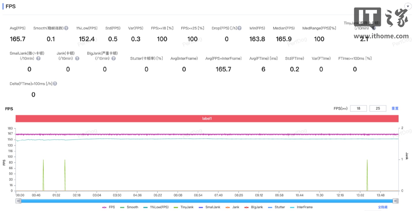 如图所示,整场测试的平均帧率达到了 165.5 fps,1% Low 帧也稳健地维持在 155fps。