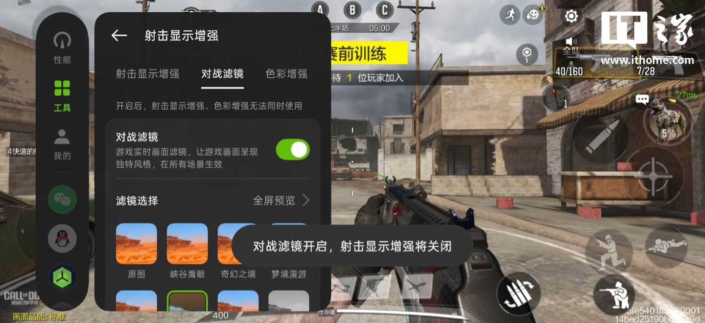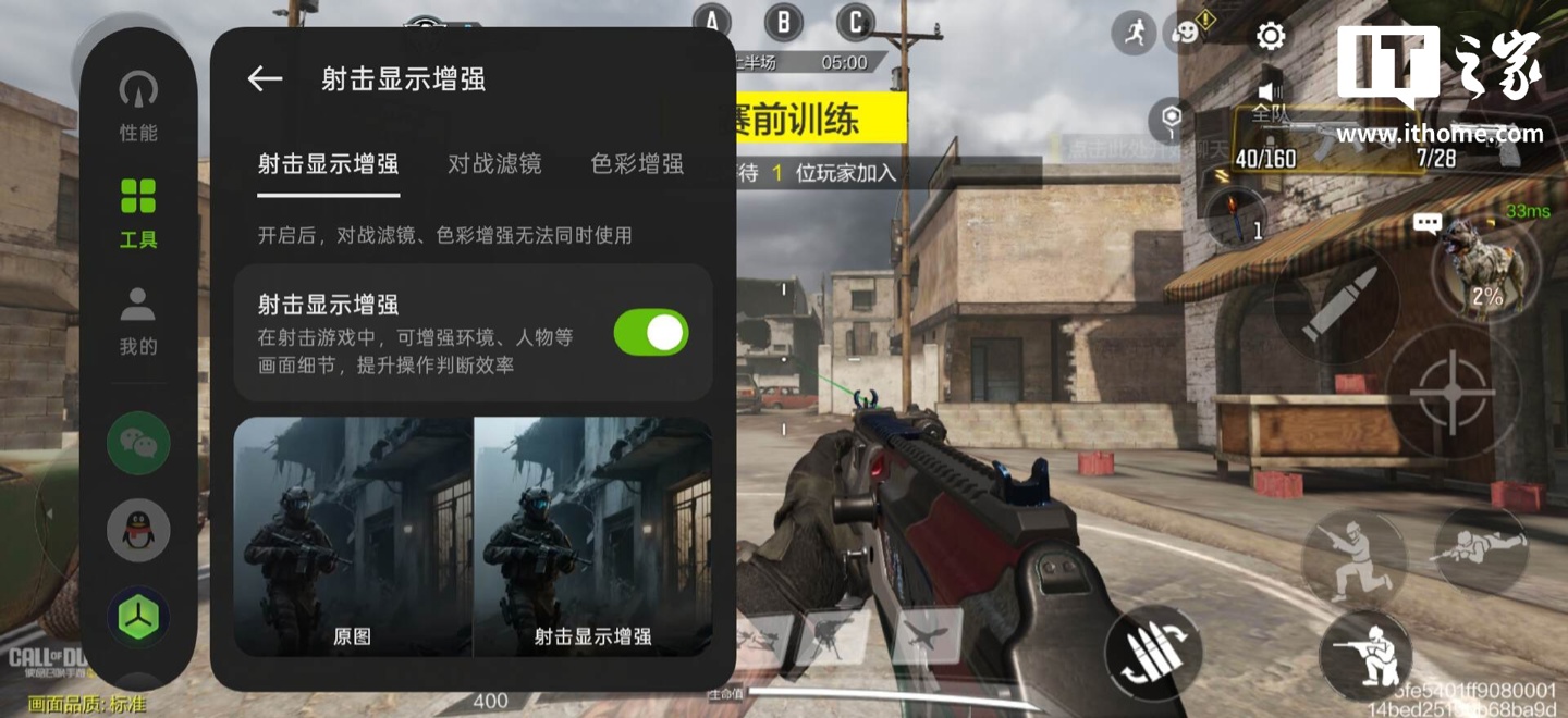 在游戏内,这块屏幕还针对射击游戏引入了独家色彩科学体系。它支持“人景分区调色”,比如加入了大量的游戏滤镜,能够智能提亮游戏战场中的暗角与阴影细节。