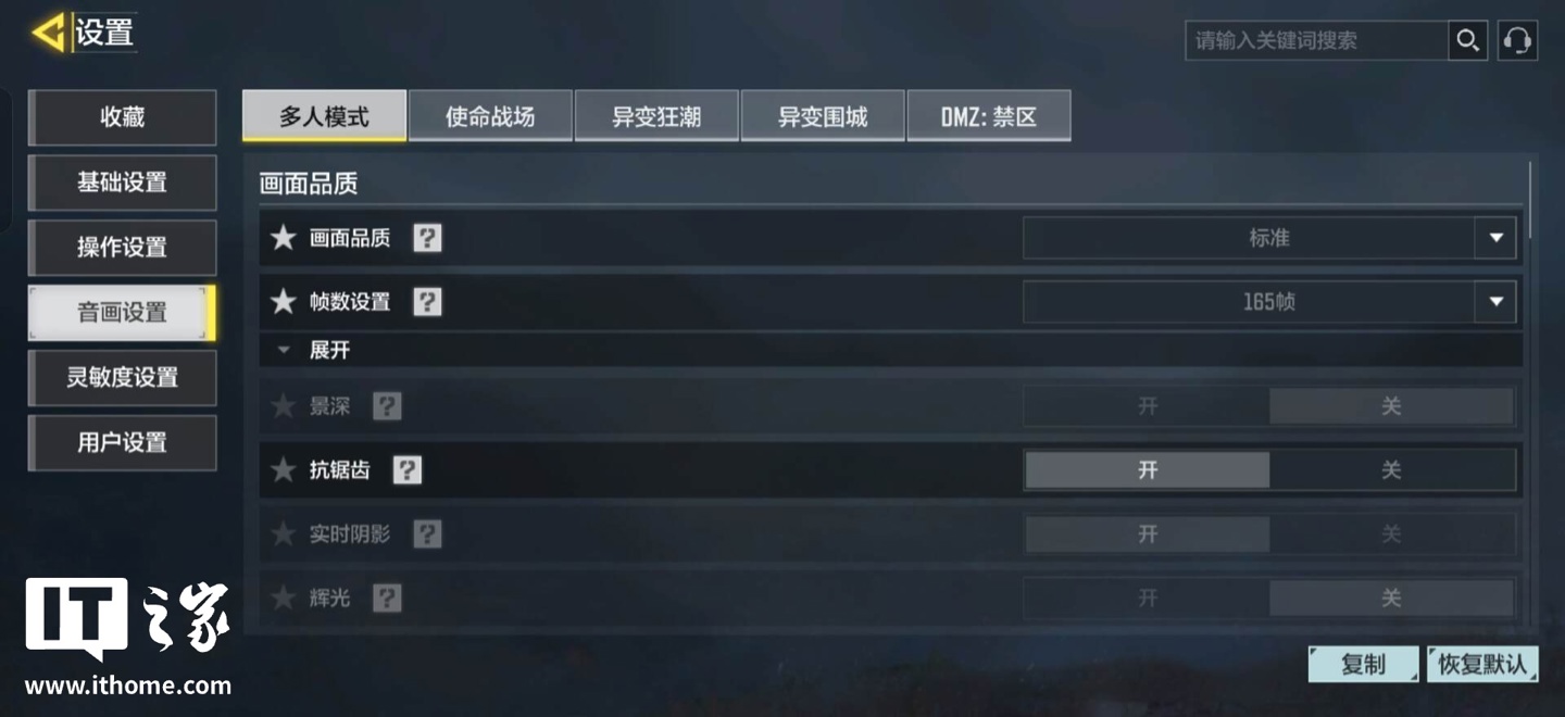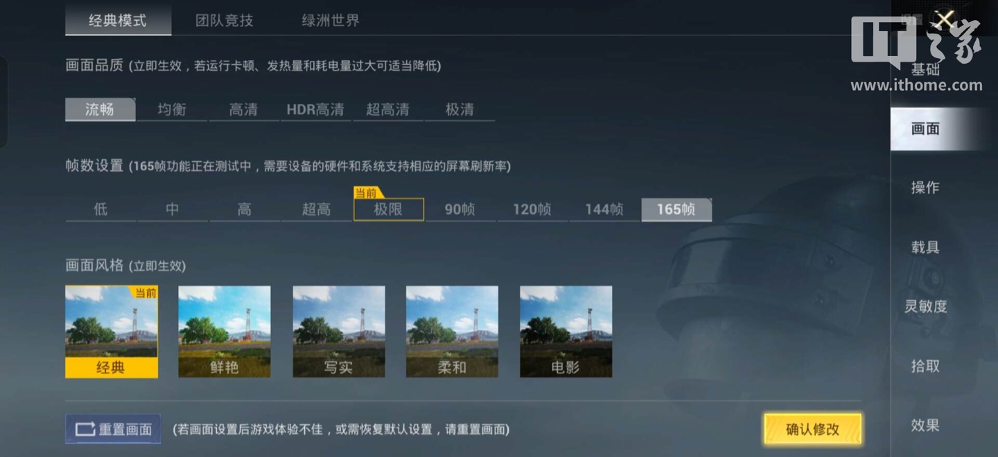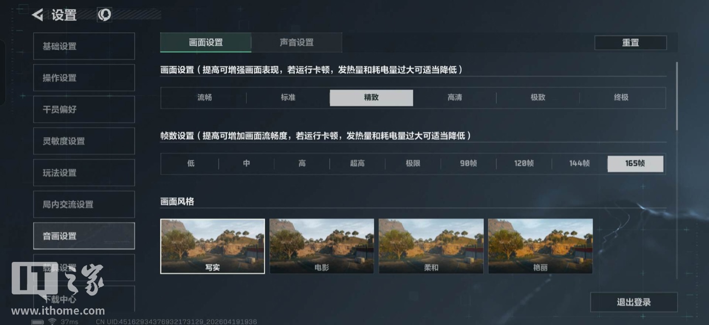在游戏设置中,IT之家直接将参数拉满,开启了最高 165 原生刷新率以及当前所能支持的最高画质 ——“精致”。
