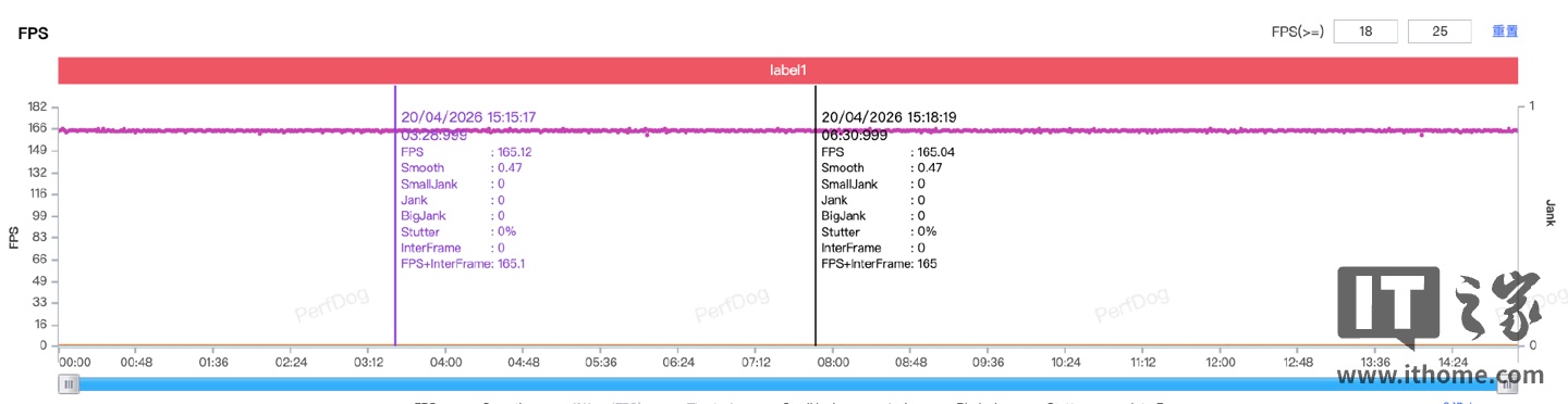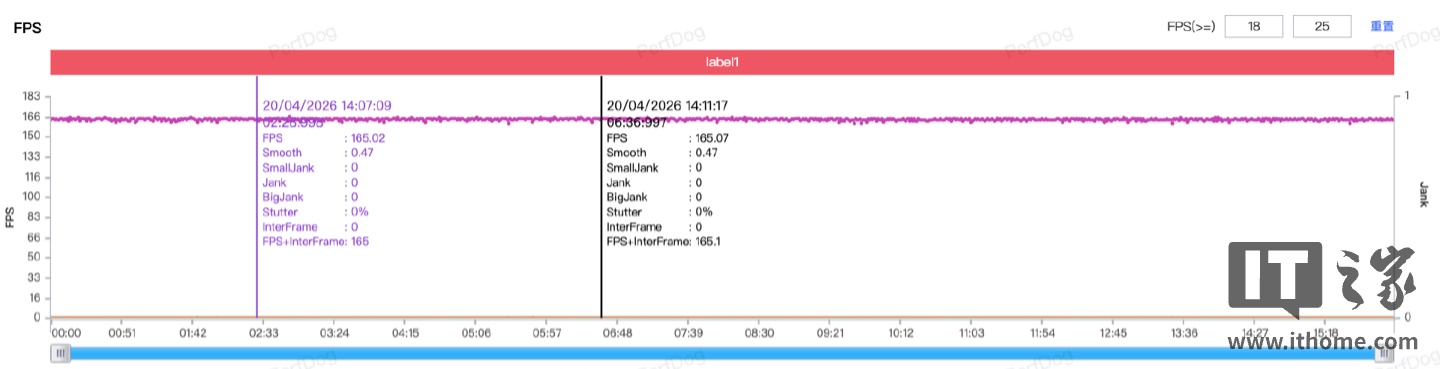 从实际的游戏表现来看,它也确实没有辜负这个定位:实测中不仅能游刃有余地保持全程 165Hz 稳如泰山的满帧运行,其「1% Low 帧」的表现也极其平稳。