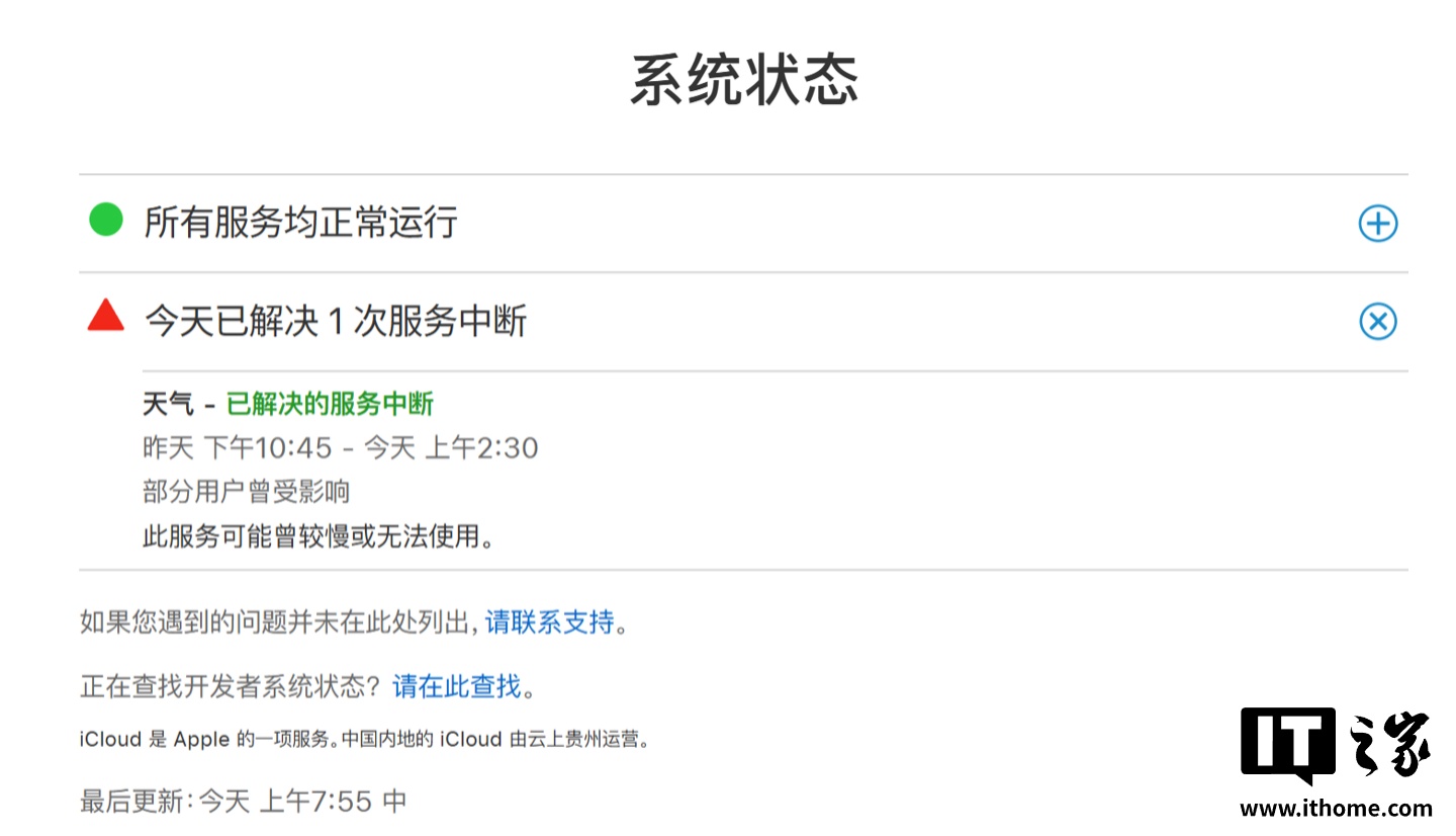 在故障期间,用户发现该应用无法正常加载天气数据。根据苹果官方系统状态页面信息,本次服务中断于北京时间 4 月 28 日晚上 10 点 45 分钟开始,到 29 日凌晨 2 点 30 分修复。IT之家附上相关截图如下: