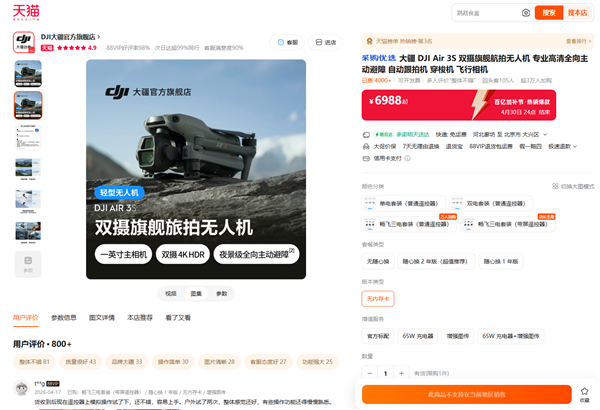 电商平台显示,目前天猫大疆官方旗舰店的无人机产品已无法选择北京地址下单,页面提示“此商品不支持在当前地区销售”。