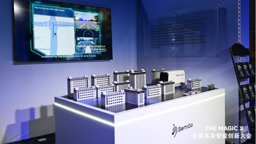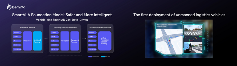 在底层技术与架构层面,斑陌易行展示了三项核心支撑技术。其一为基于Smartware2.0自研中间件的模块化软硬件架构,通过统一接口与预埋硬件支持按需组合及快速部署。其二是在算法端,公司推出了SmartVLA大模型,该模型基于英伟达Alpamayo 1.5开源基座构建,并在Jetson Thor平台上完成了无人物流车端的首次部署,结合车身搭载的7V+1L(7个视觉传感器加1个激光雷达)感知系统提供自动驾驶决策。其三,在调度管理方面,云端控制系统Brain2.0采用多智能体协同架构,打通了云端平台、监控中心与手机APP的全链路管理。