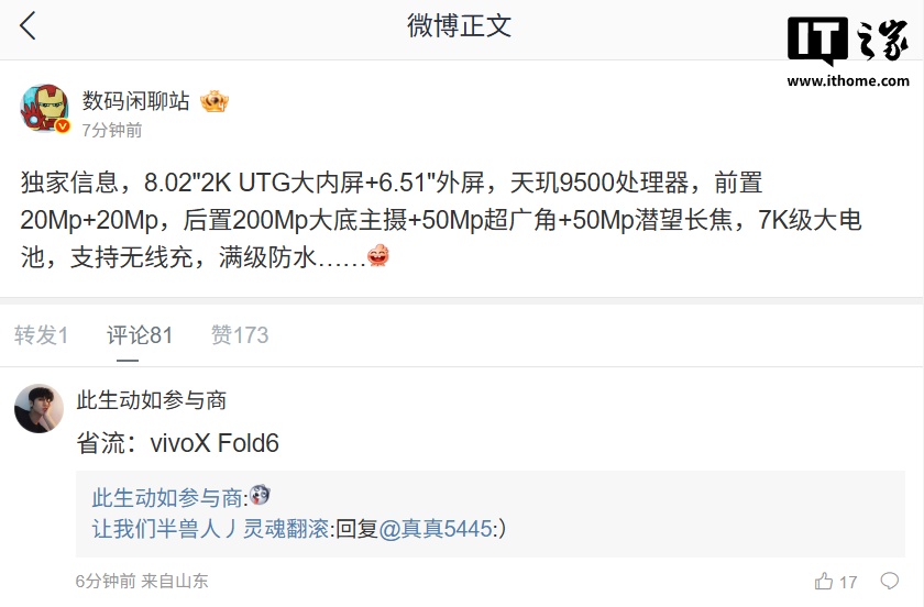 从博主暗示和评论区高赞猜测来看,预计这款手机是 vivo X Fold6。