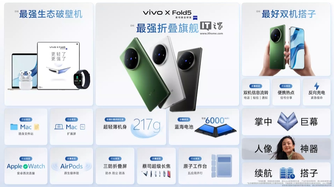 IT之家注:现款 vivo XFold5 手机于 2025 年 6 月发布,搭载骁龙 8 Gen3 处理器、采用 217g 轻薄机身设计、配备 6000mAh 蓝海电池,上市价格为 6999 元起。