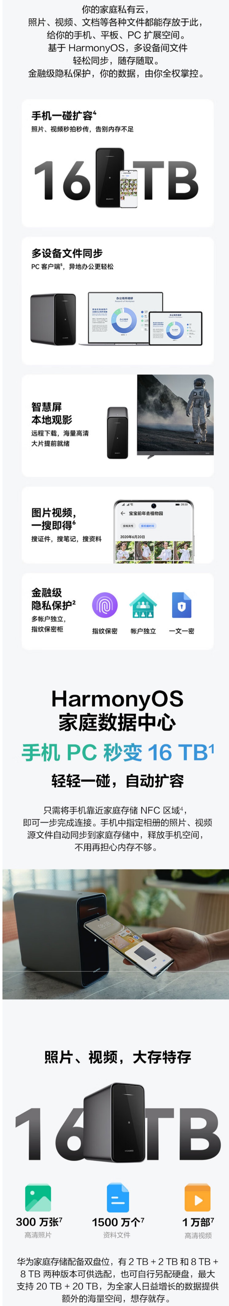 据介绍,华为家庭存储支持手机一碰扩容,只需将手机靠近家庭存储 NFC 区域,即可一步完成连接。手机中指定相册的照片、视频源文件自动同步到家庭存储中;配备双盘位,最大支持 40TB 存储(20TB+20TB)。