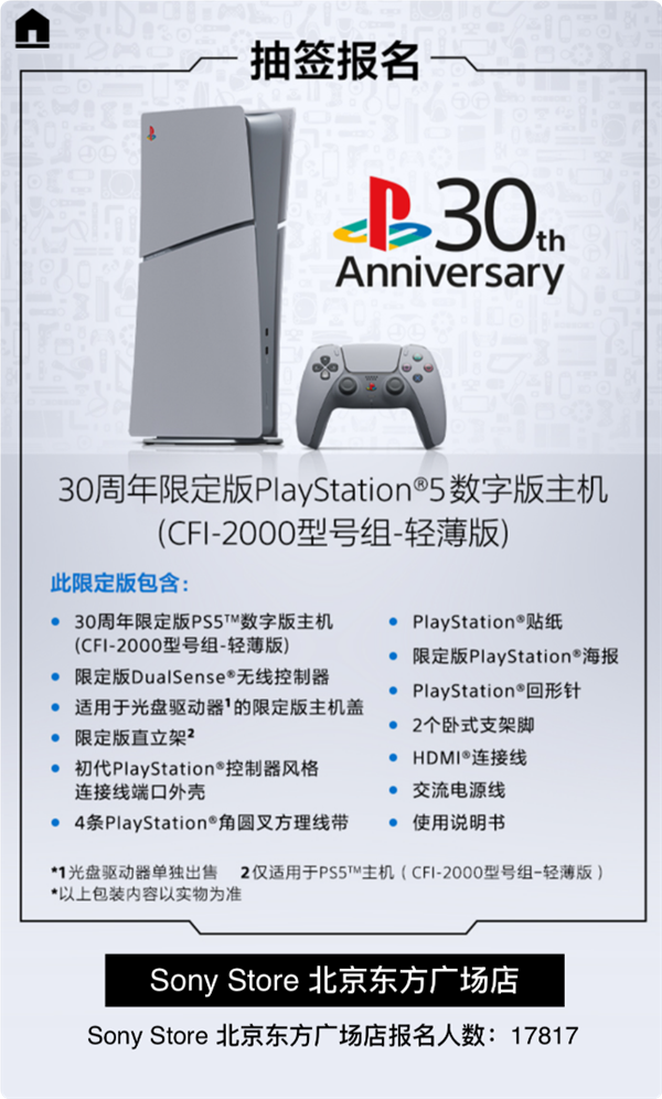 需要提醒的是,索尼国行30周年限定版PS5数量有限,且只有北京、上海、成都、广州、深圳、南京、杭州、武汉、重庆9城的索尼直营店参与此次活动。