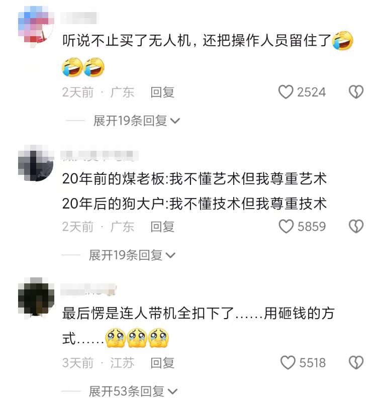面对如此“赛博法天象地”,据半岛电视台报道, 沙特王室对无人机表演极为满意,开出了天价的表演费用。 网友调侃说:沙特土豪们就算砸钱也要把无人机留下。
