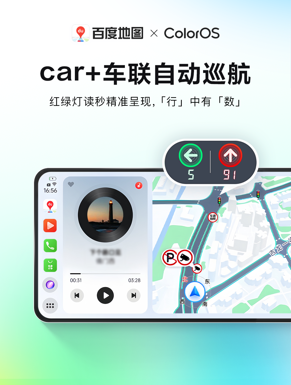 OPPO Car + 车联:支持百度地图自动巡航功能,可自动播报前方道路状况、展示精准红绿灯读秒