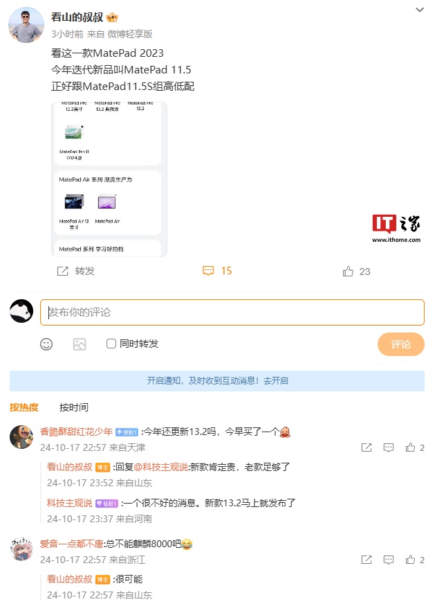 IT之家 10 月 18 日消息,博主 @看山的叔叔 昨日发文透露华为 MatePad 2023 款平板今年迭代新品叫“MatePad 11.5”,正好跟 MatePad 11.5S 组高低配。