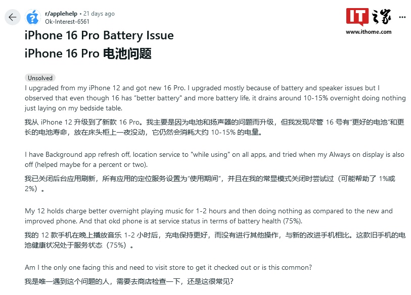博文还指出,虽然主要是 iPhone 16、iPhone 16 Pro 系列用户反馈,但也有部分升级到 iOS 18 系统的旧款 iPhone 反馈存在相同续航问题。