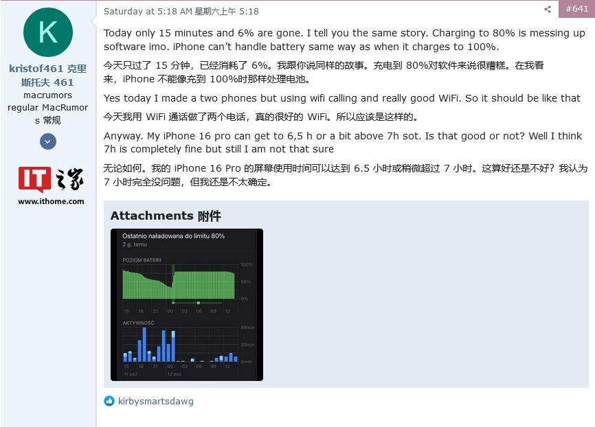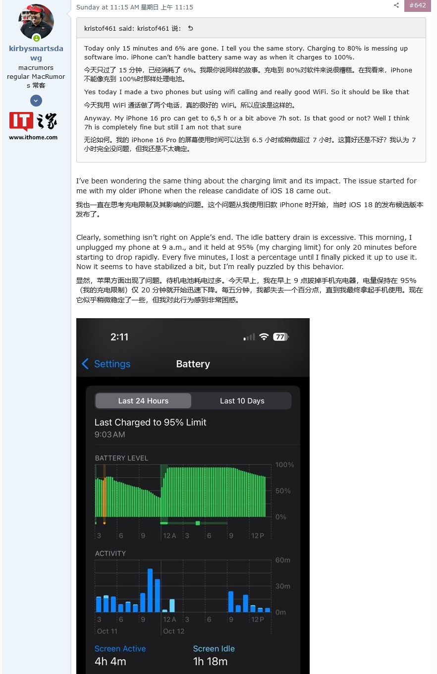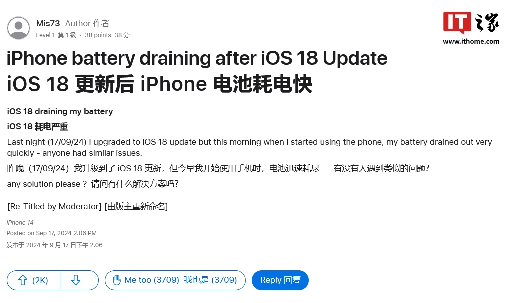 在 MacRumors 论坛上有个创建于 2024 年 6 月 10 日的 iOS 18 续航讨论帖,专门收集用户反馈,截至IT之家发稿为止,目前共盖楼 770 条,在 iOS 18 和 iPhone 16 系列发布后,相关的用户反馈更为密集。