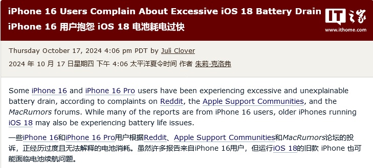 IT之家 10 月 18 日消息,科技媒体 MacRumors 昨日(10 月 17 日)发布博文,报道称根据 Reddit 社区、苹果支持论坛上的帖子和留言,部分 iPhone 16、iPhone 16 Pro 系列用户反馈 iOS 18 系统存在耗电过快问题。