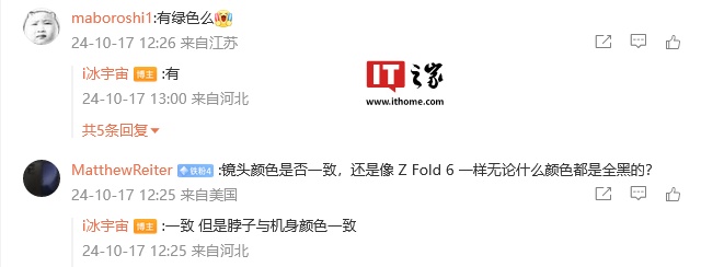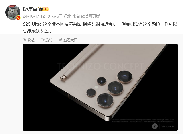 @i冰宇宙 随后发布微博,表示:“S25 Ultra 这个版本网友渲染图摄像头很接近真机,但真机没有这个颜色,你可以想象成钛灰色。”在后续和网友互动中,表示会有绿色版。IT之家附上相关截图如下: