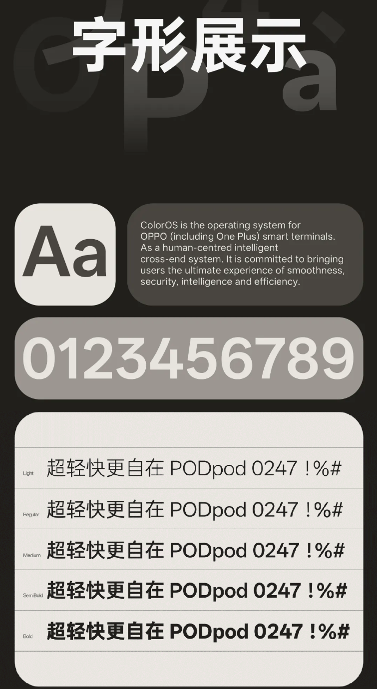 OPPO Sans 4.0 已应用在 OPPO ColorOS 15 ,字形展示如下: