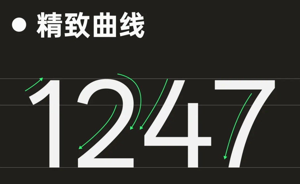 精致曲线:数字延续了品牌的特征点,强调识别,精致曲线让数字 1247 保持风格一致性