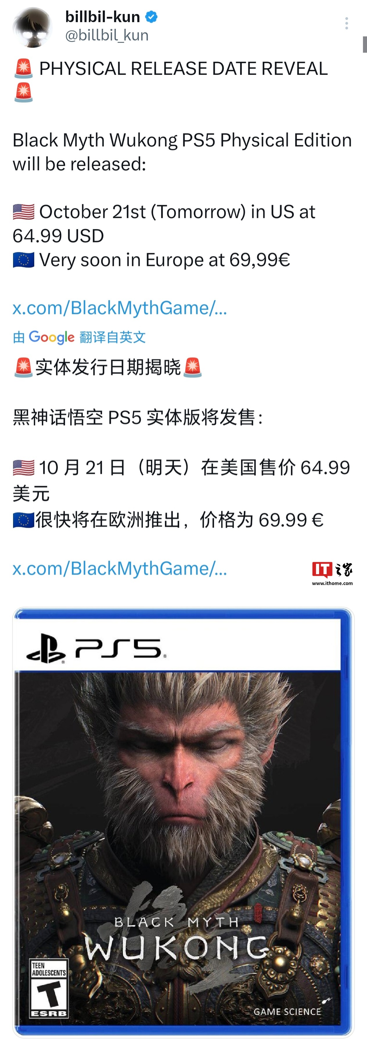 博主 @billbil_kun 今日发文透露,《黑神话:悟空》PS5 实体版将于北美 10 月 21 日发售,定价 64.99 美元(IT之家备注:当前约 462 元人民币)。同时将很快在欧洲地区发售,售价 69.99 欧元(当前约 541 元人民币)。