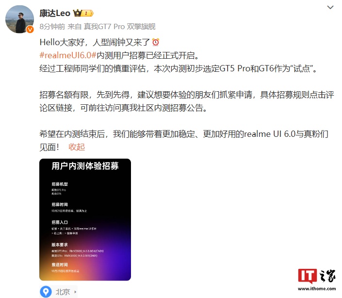 IT之家 10 月 21 日消息,realme UI 产品经理 @康达Leo 今日发文宣布,realme UI 6.0 系统正式开启“用户内测体验招募”,本次内测初步选定 GT5 Pro 和 GT6 作为“试点”。