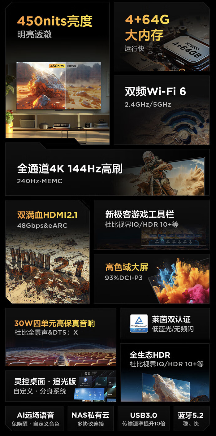 据介绍,系列电视配备 4K 144Hz VA 面板,亮度提升至 450 尼特,支持 240Hz MEMC 运动补偿及 240Hz 可变刷新率,支持 HDR10,覆盖 93% DCI-P3 色域。